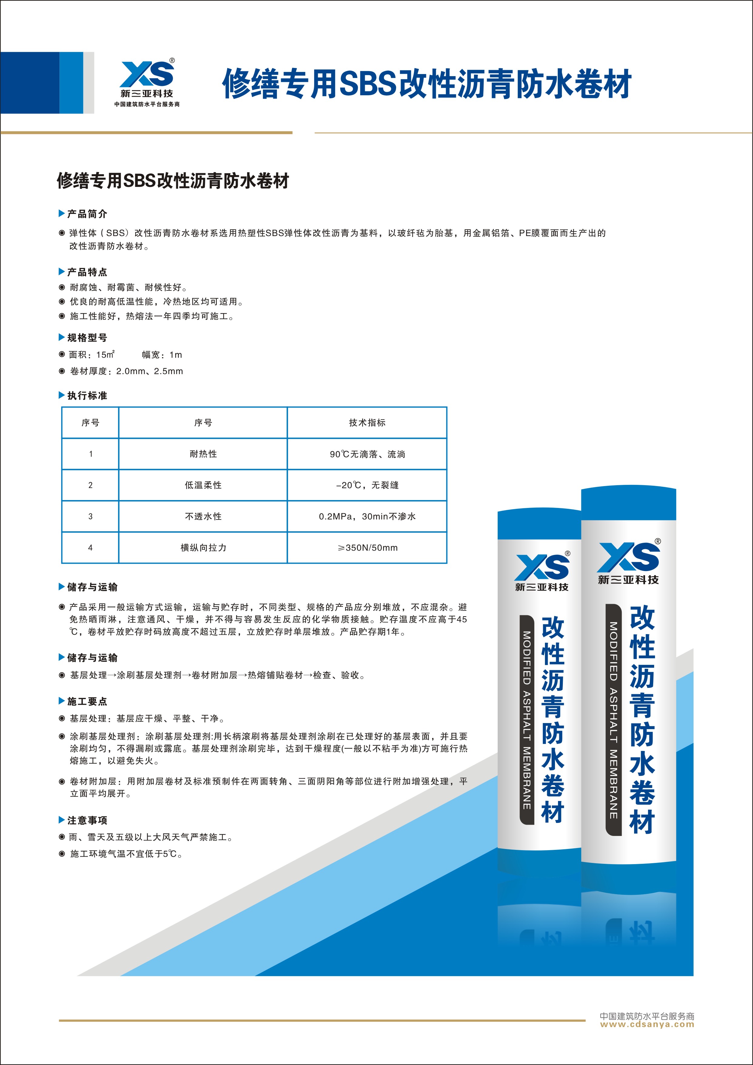 產(chǎn)品簡介: 修繕專用SBS改性瀝青防水卷材,選用彈性體(SBS)改性瀝青為基料使用玻纖氈為胎基,并上、下表面覆PE膜而生產(chǎn)出的改性瀝青防水卷材。 規(guī)格:SBS I G PE PE 2.5mm 1m×15m