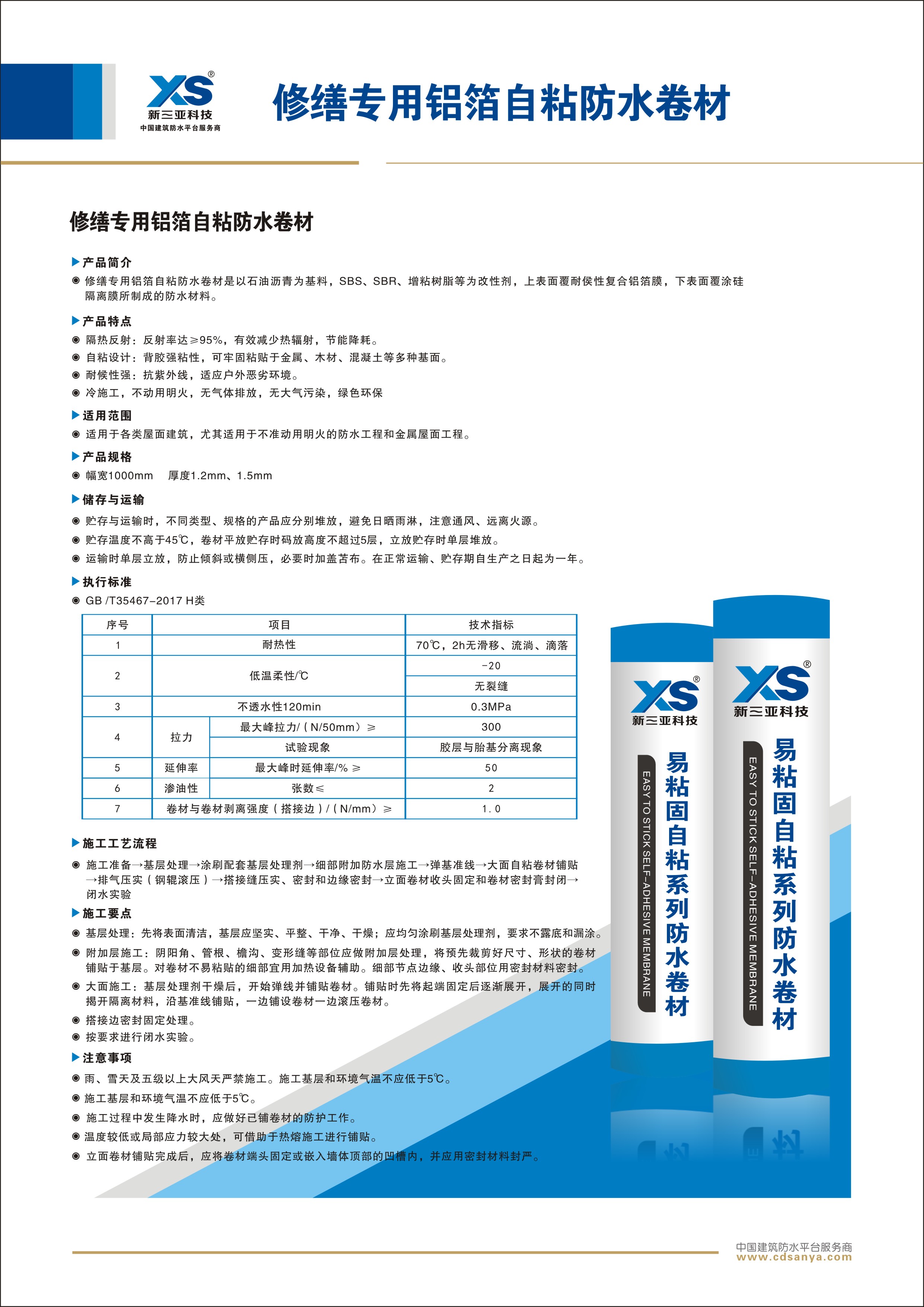 產(chǎn)品簡(jiǎn)介 修繕專用鋁箔自粘防水卷材以石油瀝青為基料,SBS、SBR、增粘樹脂等為改性劑,上表面覆耐侯性復(fù)合鋁箔膜,下表面覆涂硅隔離膜所制成的防水材料。 規(guī)格:1.2mm 1m×20 m | ![]() |