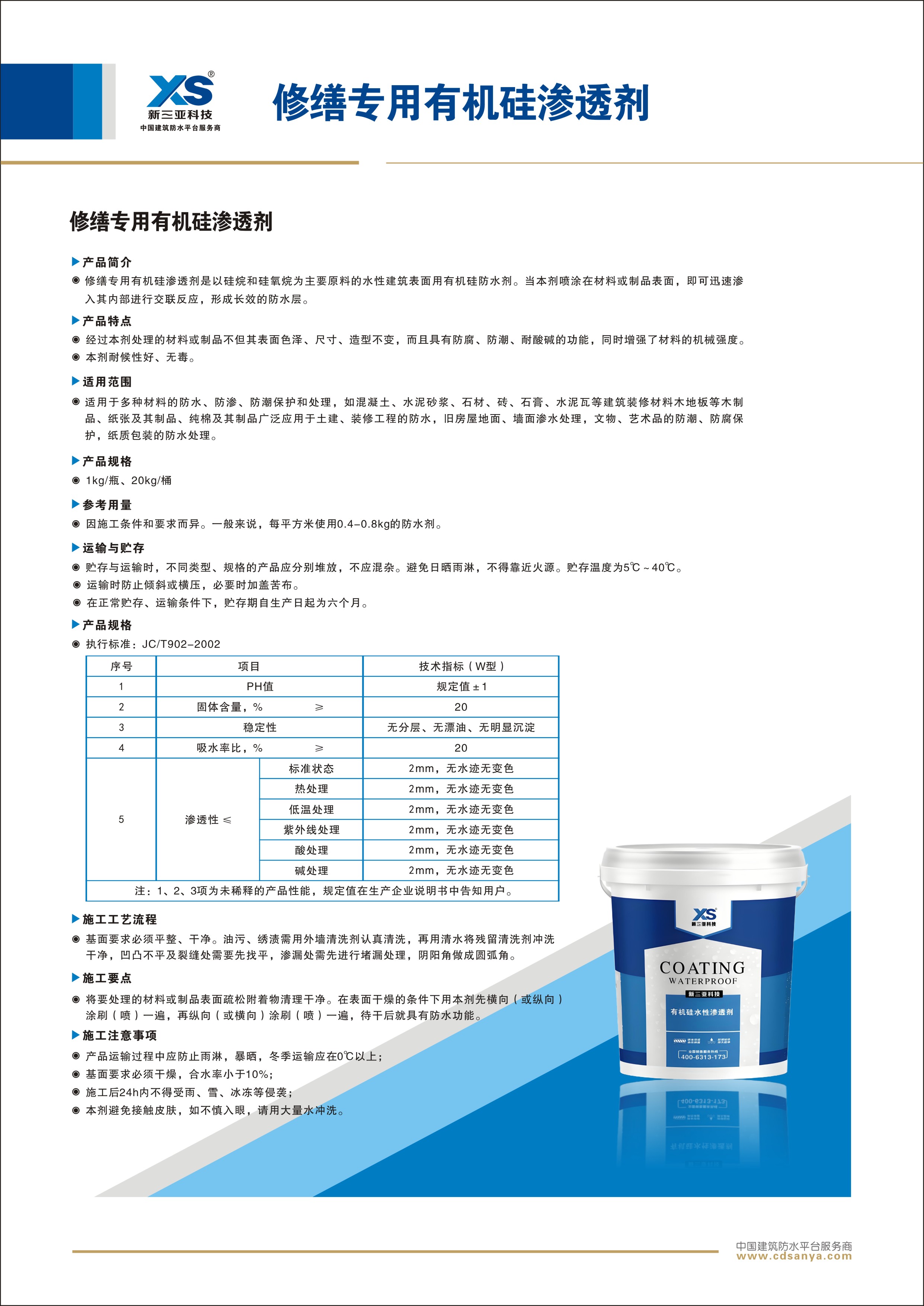 修繕專用有機硅滲透劑是以硅烷和硅氧烷為主要原料的水性建筑表面用有機硅防水劑。當本劑噴涂在材料或制品表面,即可迅速滲入其內(nèi)部進行交聯(lián)反應,形成長效的防水層。